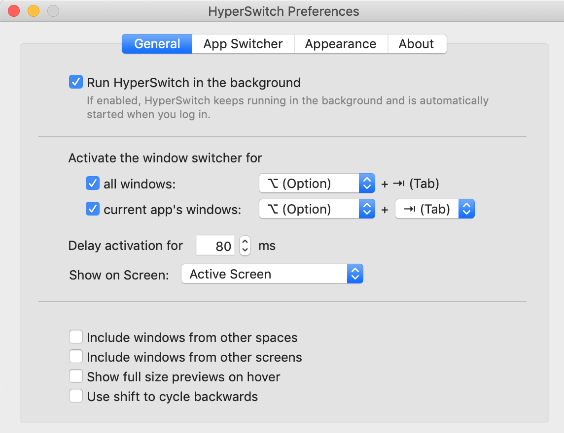current app's windows의 설정이 option + tab이라면, option + tab 단축키 누를 시에 동일 응용프로그램 내에서만 전환이 일어난다.